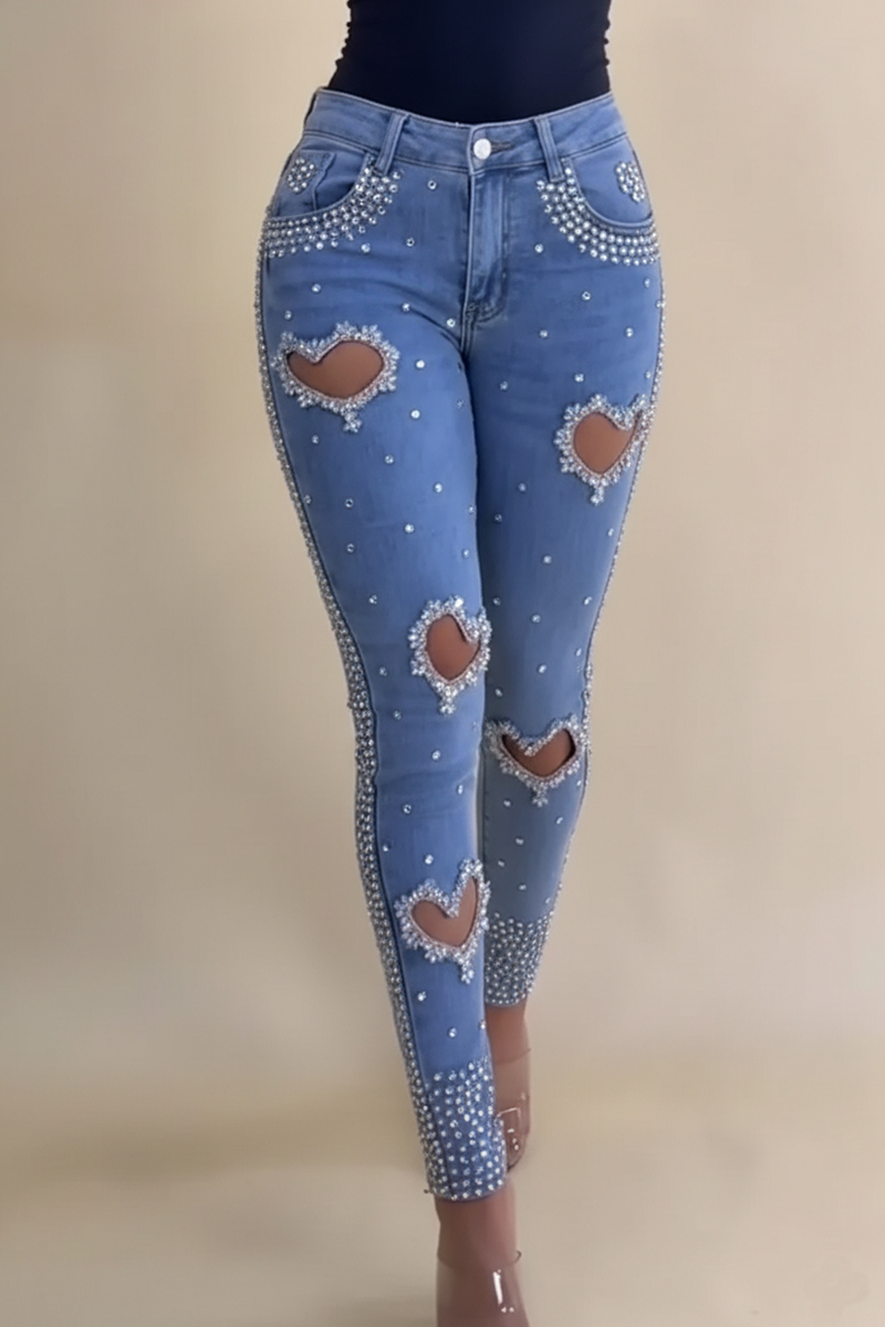 Women's Revival Style Rhinestone Heart-Shaped Cutout Jeans