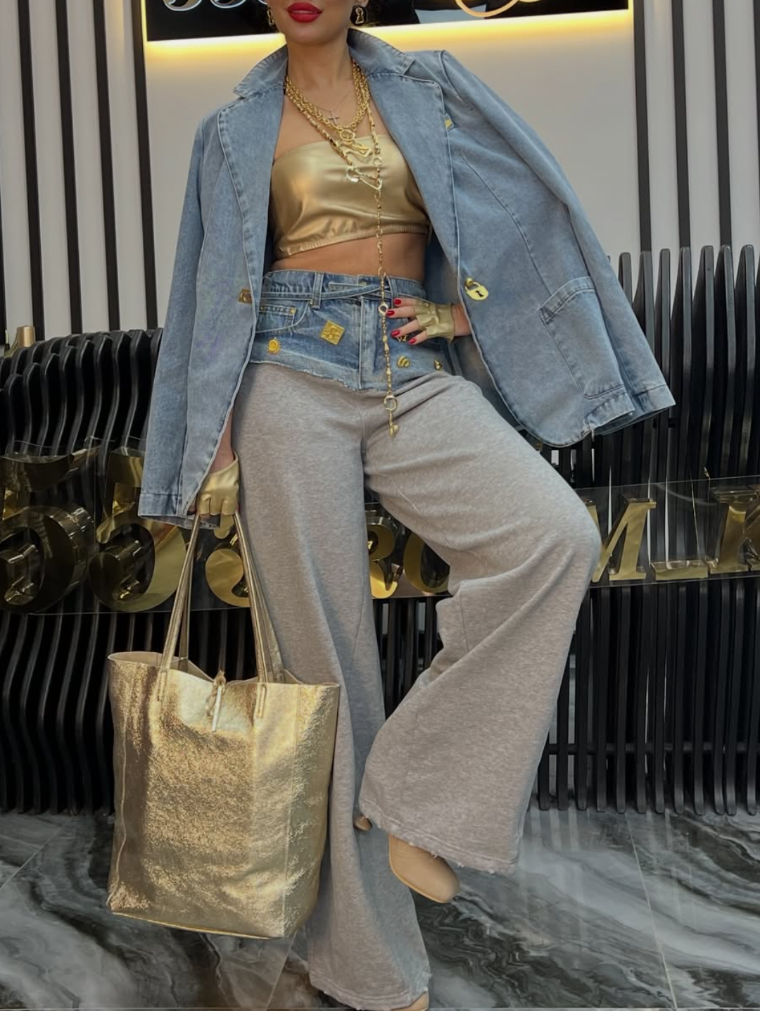 Ladies' Casual Evil Eyed Gold Foil Top And Shiny Pants