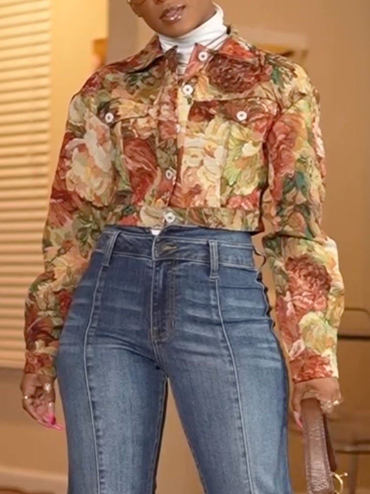 Women's Lapel Printed Jacket + Jeans Casual Set