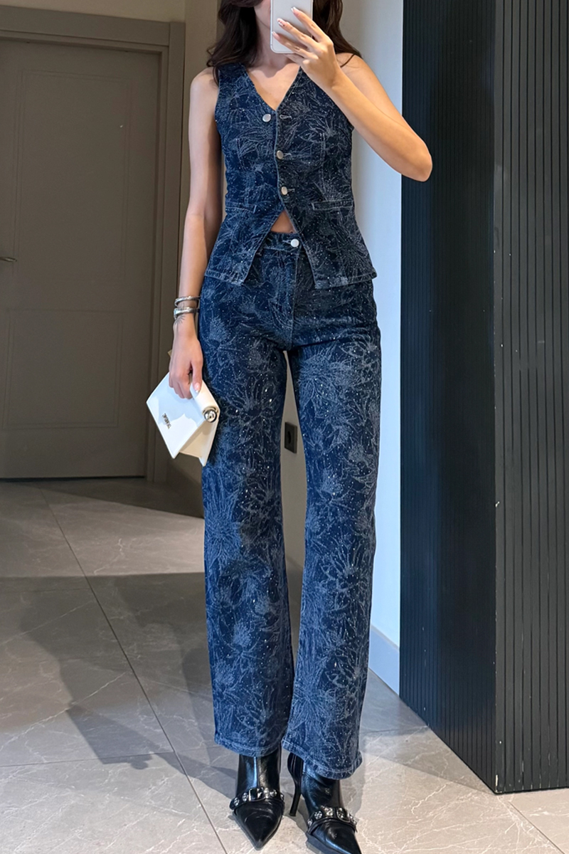 Ladies' Spring And Summer Textured Rhinestone Denim Vest Top And Straight Leg Jeans