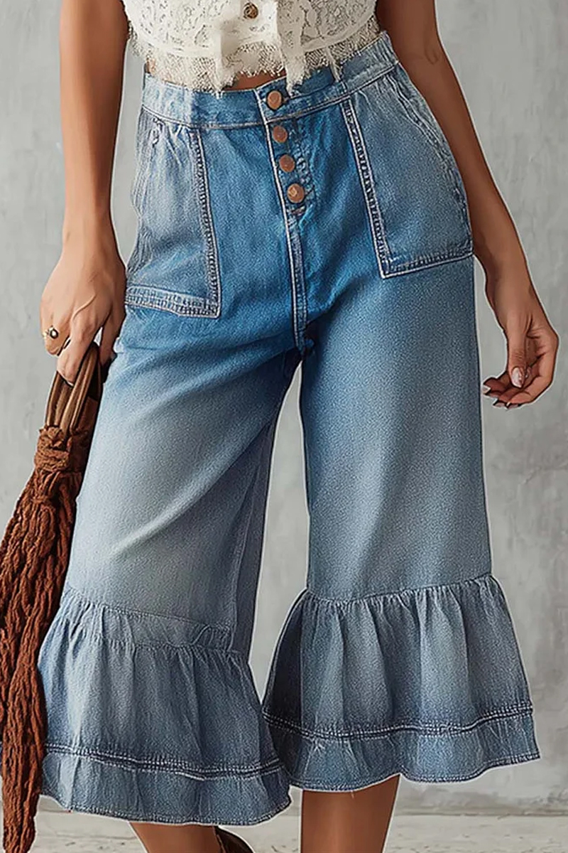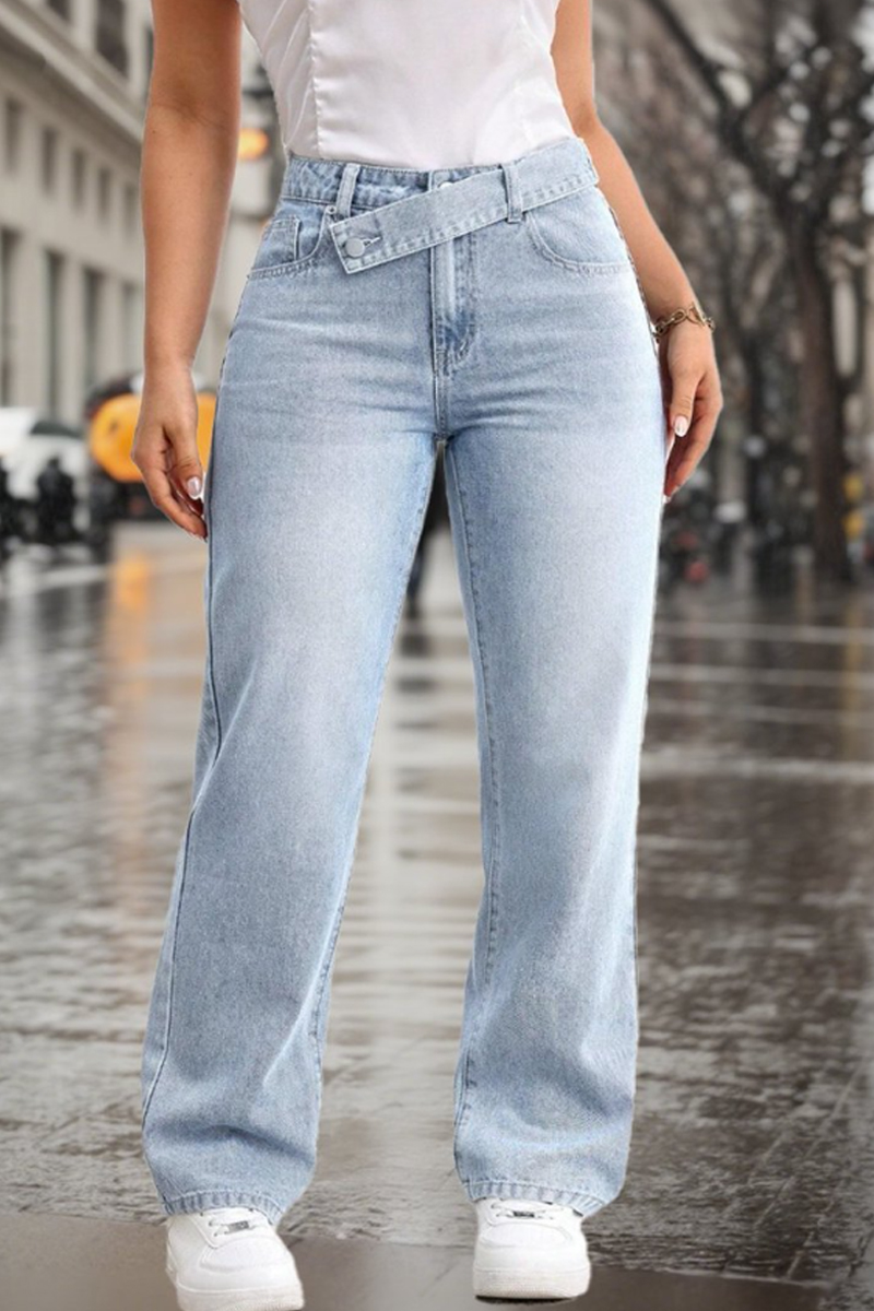 Ladies' Casual Washed Denim High Waisted Irregular Wide Leg Jeans