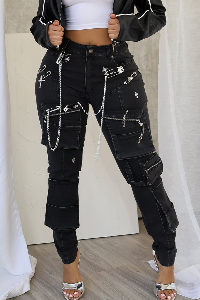 Women's Casual Multi-Pocket Denim Jeans With Decorative Charm