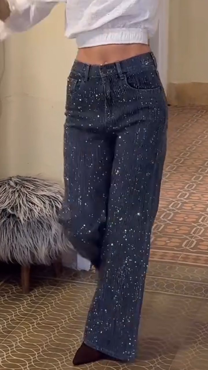 Wide-Legs Jeans with Luxe Rhinestone Waist Detail