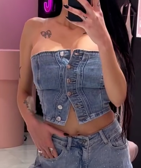 Female Strapless Tops + Denim Jeans with Rhinestones and Crop Top