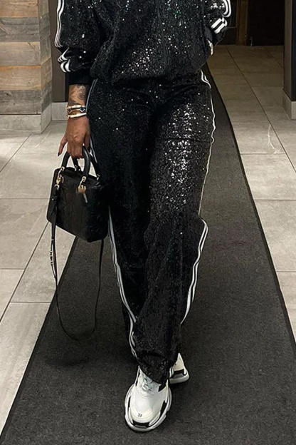 Ladies' Casual Sequin Spliced Striped Jacket And Pants