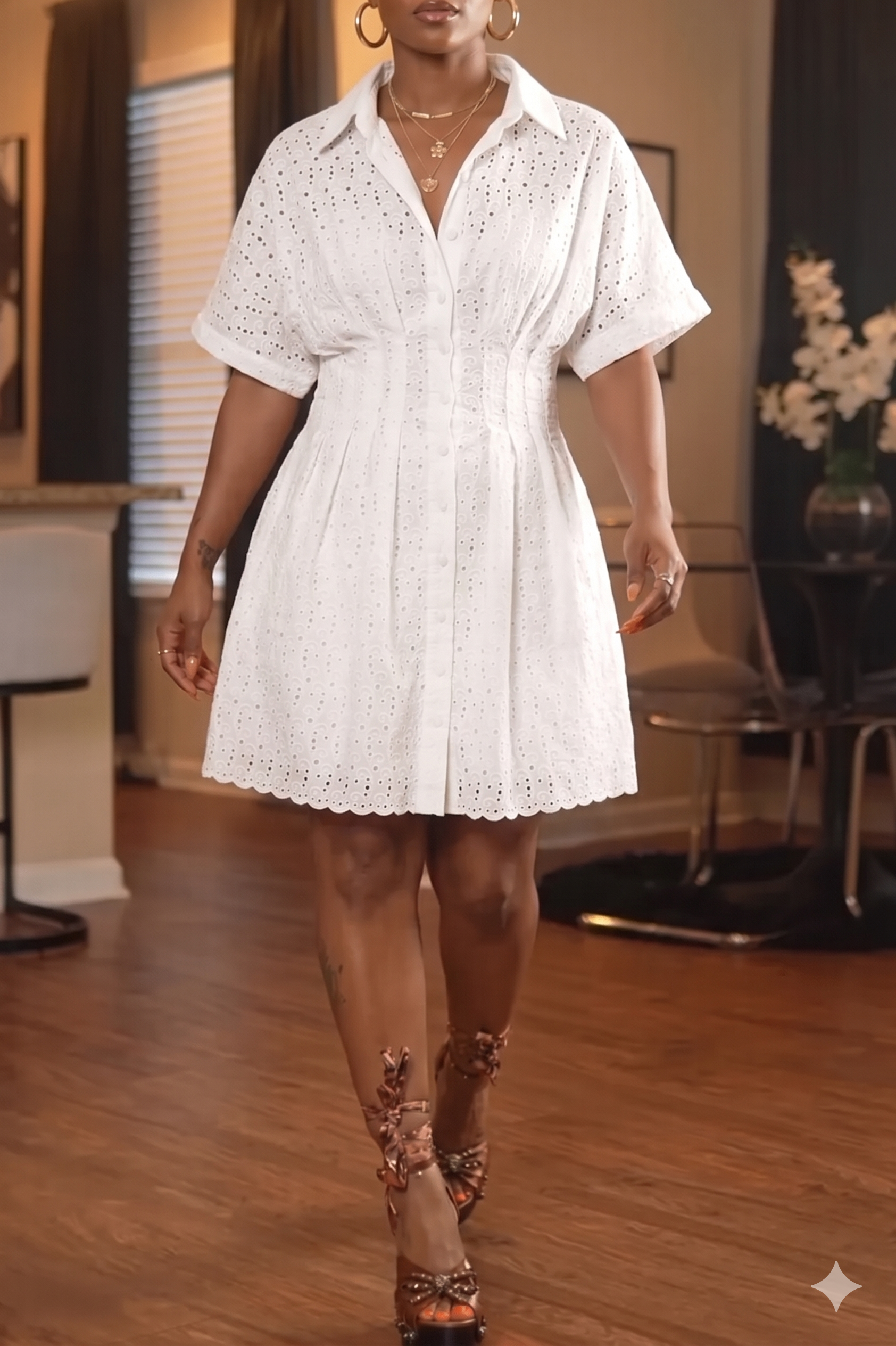 Ladies' Fashionable Bubble Sleeve Shirt With Polka Dot Print Asymmetrical Hem Dress, Paired With Belt