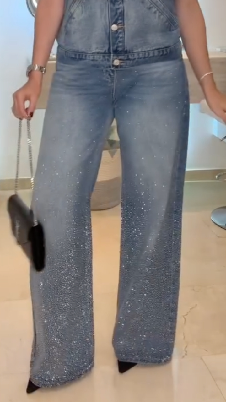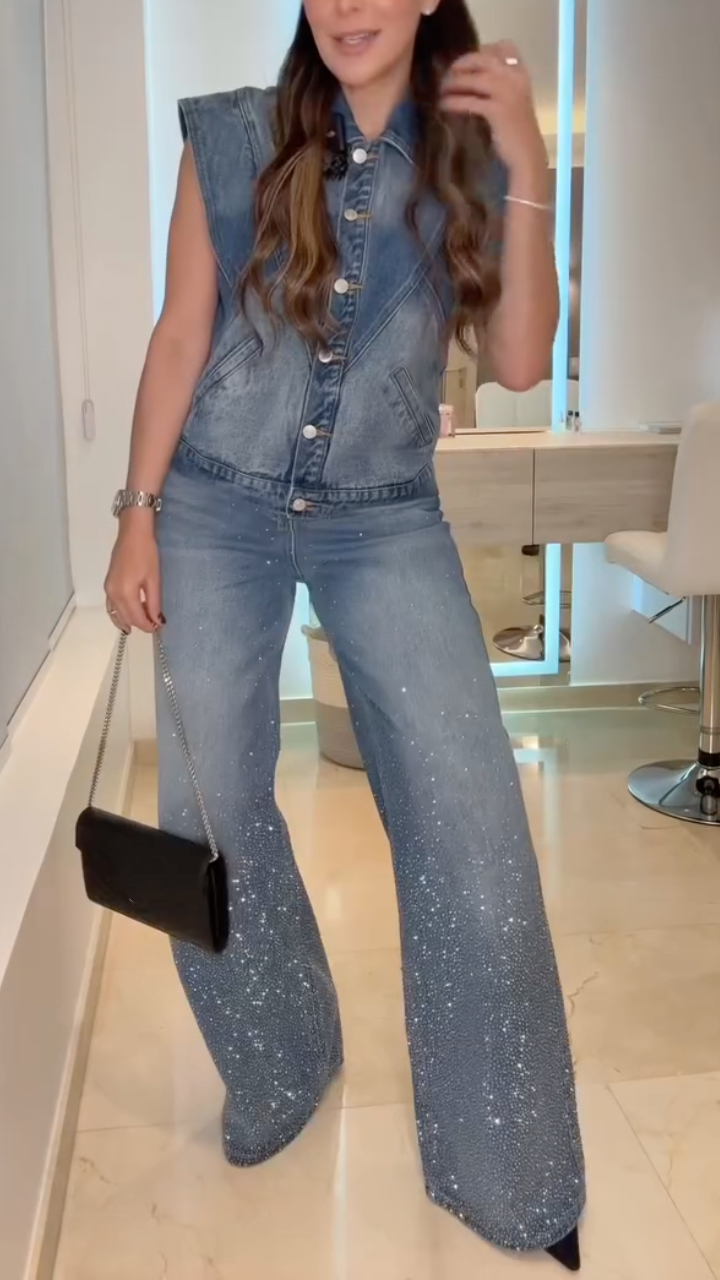 Women's Sleeveless Collared Denim Top + Rhinestone-studded Jeans